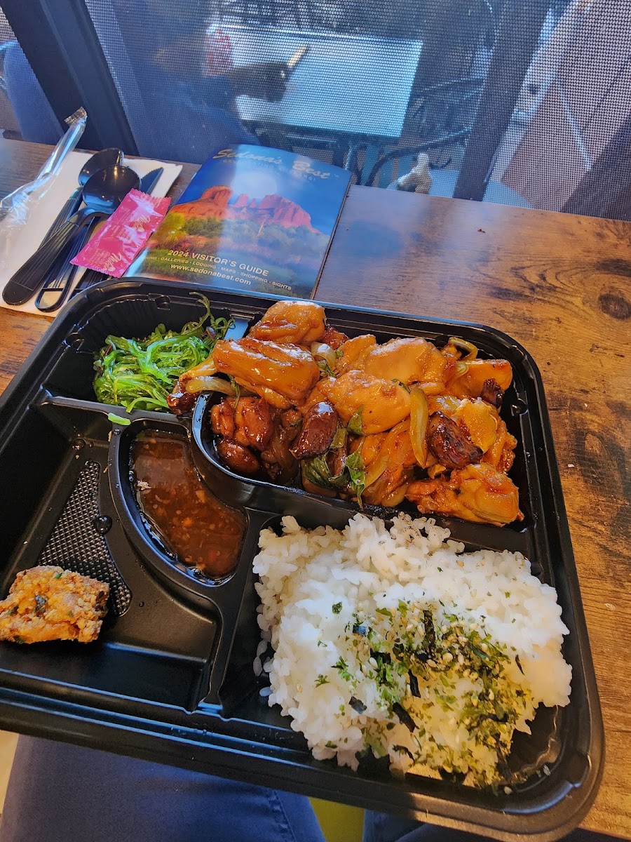 Perfectly located for shopping days by Oak Creek Canyon stores. It offers free parking in the back (although limited), & had a self service kiosk for ordering. The boba and smoothie selection was unique and exotic, while the hot food items were pretty authenticly Asian as well. The drinks came out much quicker than the food items though. We were almost finished our drinks by the time the food was ready to pick up. I think they do alot of Doordash or Uber Eats bc there's a separate pickup area that seemed to take precedence over our wait in line orders. The drinks and food were very good - especially the drinks and their fried calamari. You could tell it was fresh and not frozen product they were using. The chicken with the basil accent was also yummy (if you expect and like dark meat). The only thing I was alittle disappointed in was the scallops. The description on the menu was JUMBO scallops. The ones I got were certainly small to medium at best (even with the breading!). I could tell they were also fresh too, & came with a yummy sauce, so I'm ok with it...but probably wouldn't order again or recommend. The seating outside had some good people watching vibes, along with the Red rocks off into the distance so the ambiance was casual and relaxing for a quick snack or lunch.